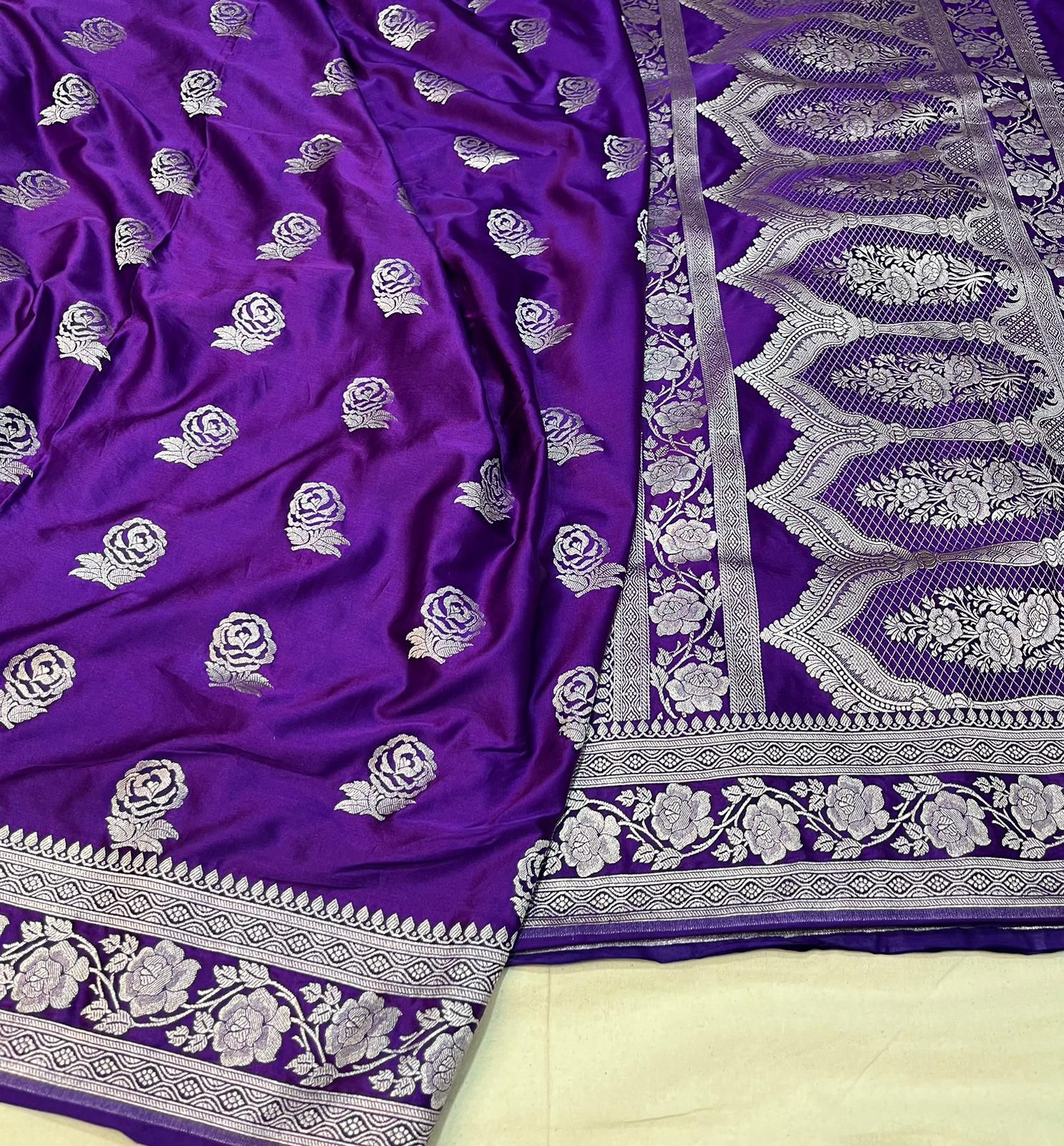 Beautiful Banarasi Mashru Silk Handloom Saree with pure zari weaving. This saree has a elegant shine. It’s lightweight, buttery soft, and drapes nicely — perfect for weddings and parties.