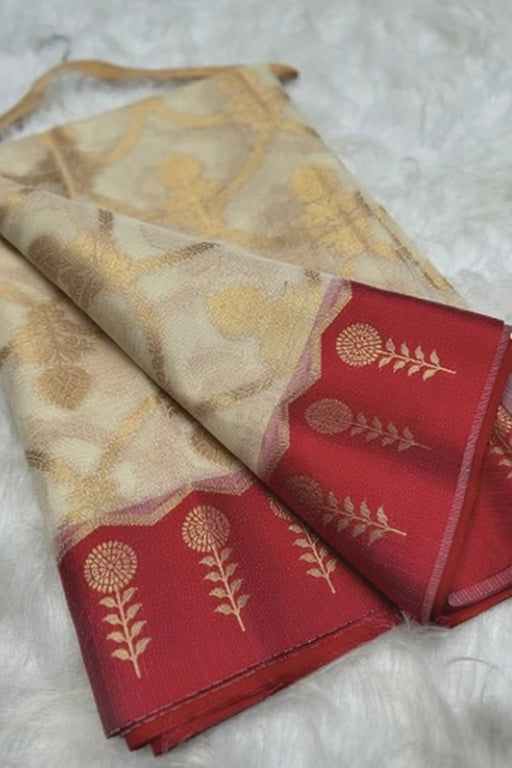 The look is accentuated with a super-trending satin butta border, a rich contrast Jacquard pallu, and a Jacquard contrast brocade blouse, creating the perfect ensemble for festive and wedding occasions.