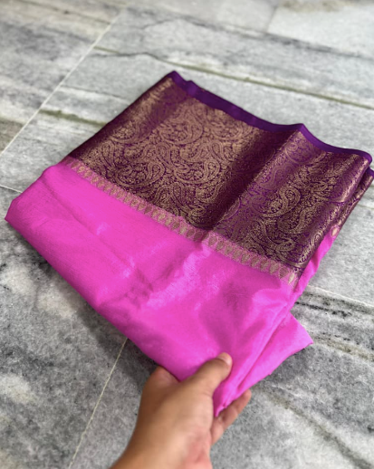 Designed with a premium full-body plain weave, this saree highlights a fancy, trending contrast border that elevates its festive appeal. The look is beautifully completed with a rich contrast Jacquard pallu and a coordinated blouse, making it an effortless choice for Eid celebrations, festive gatherings, and elegant traditional wear.